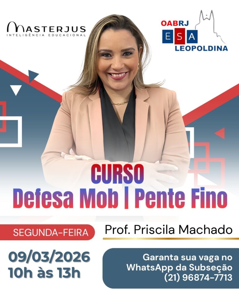 No dia 09 de março de 2026, a OABRJ Leopoldina realizará o Curso Defesa MOB | Pente Fino, com foco em conteúdos práticos e atualizados para fortalecer a atuação da advocacia previdenciária.