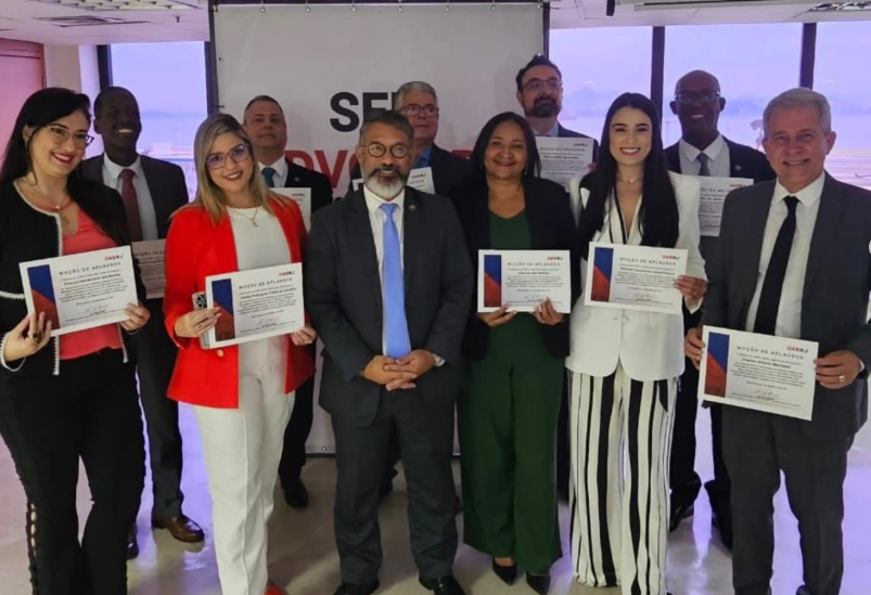 Na manhã do dia 02/12/2025, o Dr. Alexandre Aguilar, presidente da Subseção, representando todas as subseções, participou ao lado da Drª Ana Tereza Basílio, presidente da OABRJ, da solenidade de outorga de Moção de Aplausos realizada na Seccional. Estiveram presentes, compondo a mesa, o Desembargador Caetano Costa; Eliane Molinaro, diretora-geral da ABA; Fábio Nogueira; e Ricardo Menezes, assessor da Presidência.